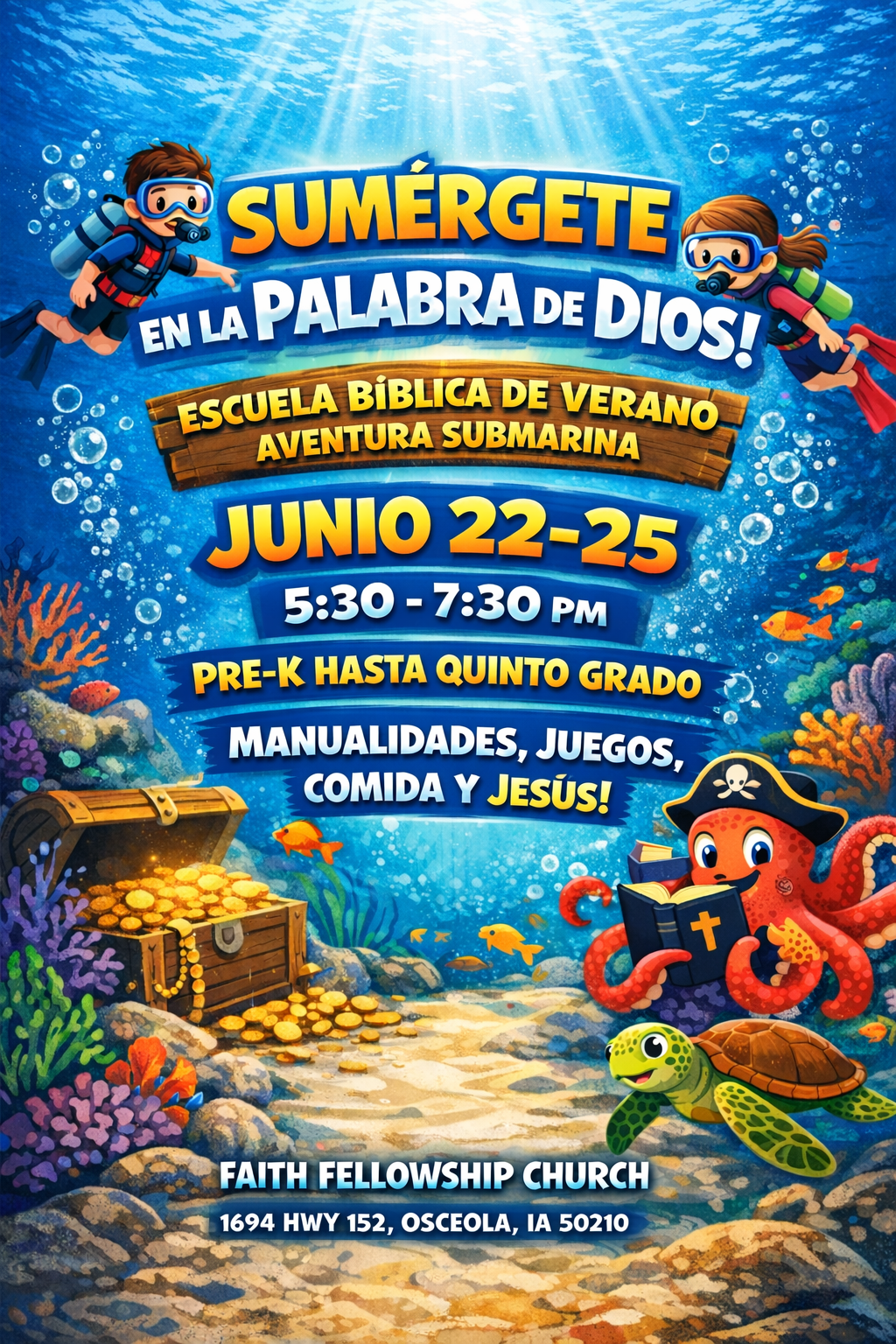 Get ready to dive deep and discover the treasures of God’s Word at our Ocean Adventure SCUBA VBS! From June 22–25, 5:30–7:30 pm, children in Pre-K through 5th grade are invited to join us at Faith Fellowship Church for four exciting evenings packed with faith-filled fun. Each night, kids will explore Bible truths in creative and engaging ways through hands-on crafts, energetic games, delicious food, uplifting worship, and meaningful lessons about Jesus. Our underwater theme will take children on an unforgettable adventure where they’ll learn that no matter how deep the waters, God’s love goes even deeper. We can’t wait to welcome your family for a week of laughter, learning, and life-changing truth!
